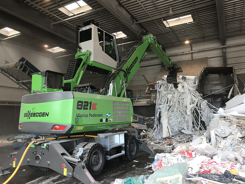 Danish recycler Marius Pedersen A/S recently commissioned this SENNEBOGEN 821 M waste handler, which combines clean, efficient electric-drive with independent mobility within the indoor facility.